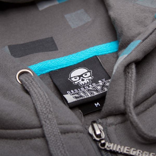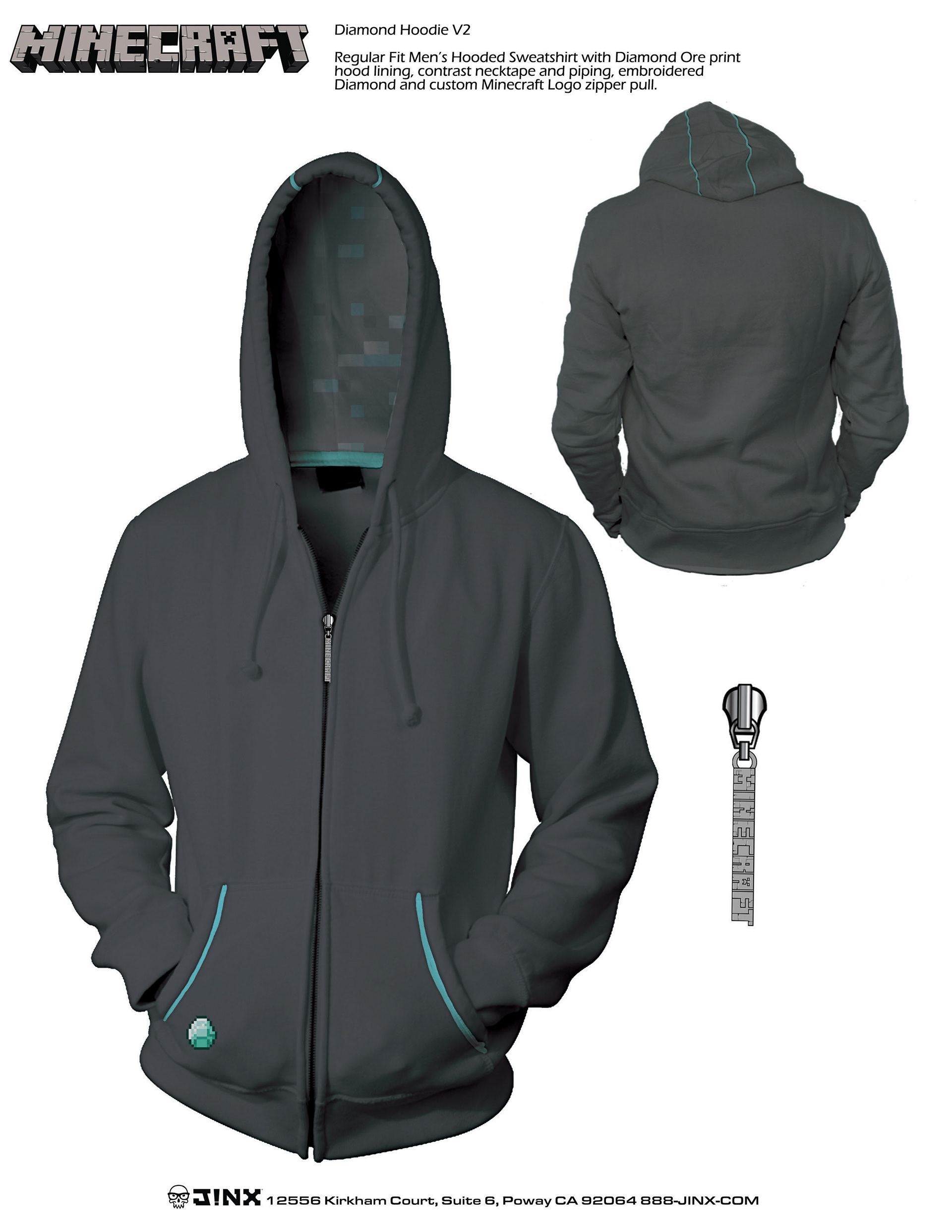 This unisex grey hoodie brings the casual elegance of sought after Minecraft diamonds to a comfortable classic hooded sweatshirt. With an embroidered diamond icon, printed diamond ore pattern at the hood lining, and custom Minecraft logo zipper pull, this hoodie combines subtle game elements into a wearable garment. Available in adult or youth sizes.